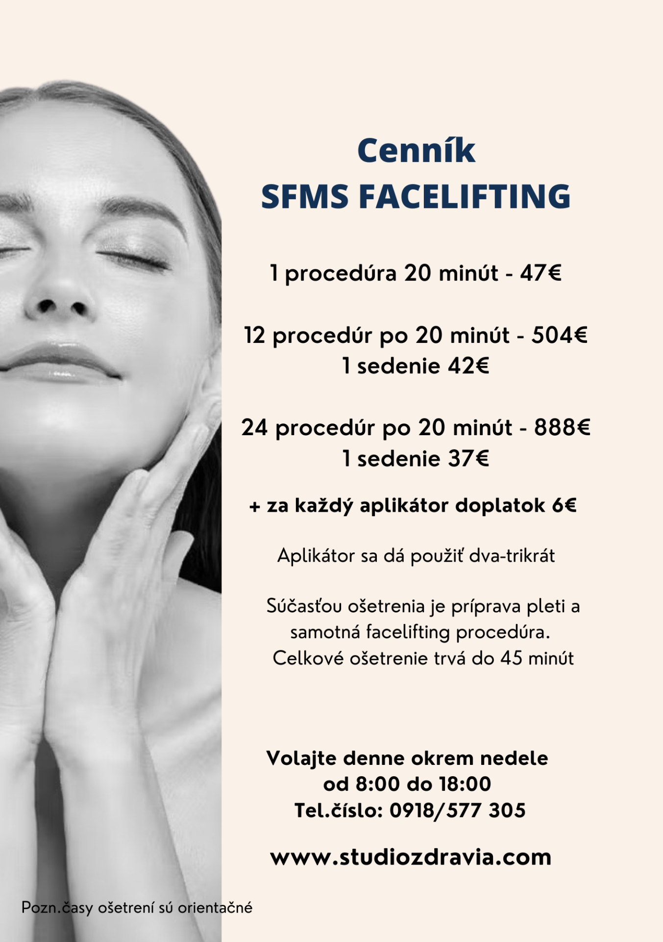 SMFS facelifting je procedúra na omladenie a spevnenie svalstiev tváre, ktorá využíva vysokú intenzitu elektromagnetickej stimulácie tváre a rádiofrekvenčnú (RF) energiu, na pozdvihnutie a vytvarovanie kontúr tváre a zároveň redukciu vrások. Je to jediné neinvazívne ošetrenie tváre, ktoré sa zameriava na pleť, aj základné svaly, ktoré pomáhajú tvoriť základ našej tváre. Zároveń stimuluje svalové bunky, na zvýšenú tvorbu vlastného kolagénu.