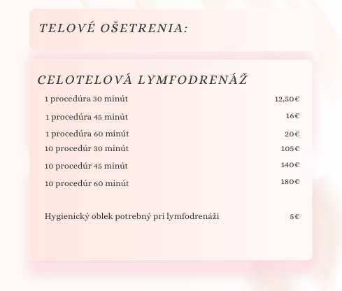Cena jedného ošetrenia sa pohybuje od 15€ - záleží na partii tela, ktorú ošetrujeme. Nižšie sa môžete objednať na ošetrenie pomocou formulára, prípadne nám priamo zavolajte na tel. číslo 0918 / 577 305